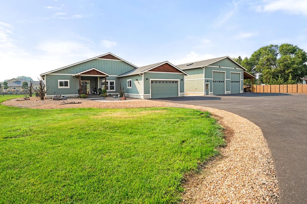Your private retreat on the edge of town! Built in 2020, this single-level custom home offers the serenity of country living with stunning mountain views—just minutes from everyday conveniences. Entertain in style with an expansive great room under vaulted ceilings, a chef's kitchen with leathered granite counters, custom cabinetry, and a massive island designed for gatherings. The private primary suite is a true escape, featuring spa-like amenities, patio access, and a hot tub for year-round relaxation. Guests will love the spacious bedrooms with Jack & Jill bath and ensuite options, while you'll enjoy outdoor living at its finest—complete with a tranquil pond and waterfall. And the crown jewel? A dream 40x 48 shop with two 12' x 14' automatic doors, four 50AMP plugs, RV dump, pneumatic lines, commercial exhaust fan, office, plus an additional room with full bath and laundry. Perfect for hobbies, hosting, or simply enjoying the space you've always dreamed of.